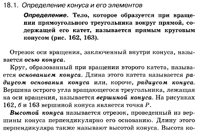 Определение конуса, его основания, вершины, оси, осевого сечения, высоты, образующих, боковой и полной поверхностей, угла при вершине осевого сечения. Определение равностороннего конуса. Формулы боковой и полной поверхностей конуса. Формула объёма конуса
